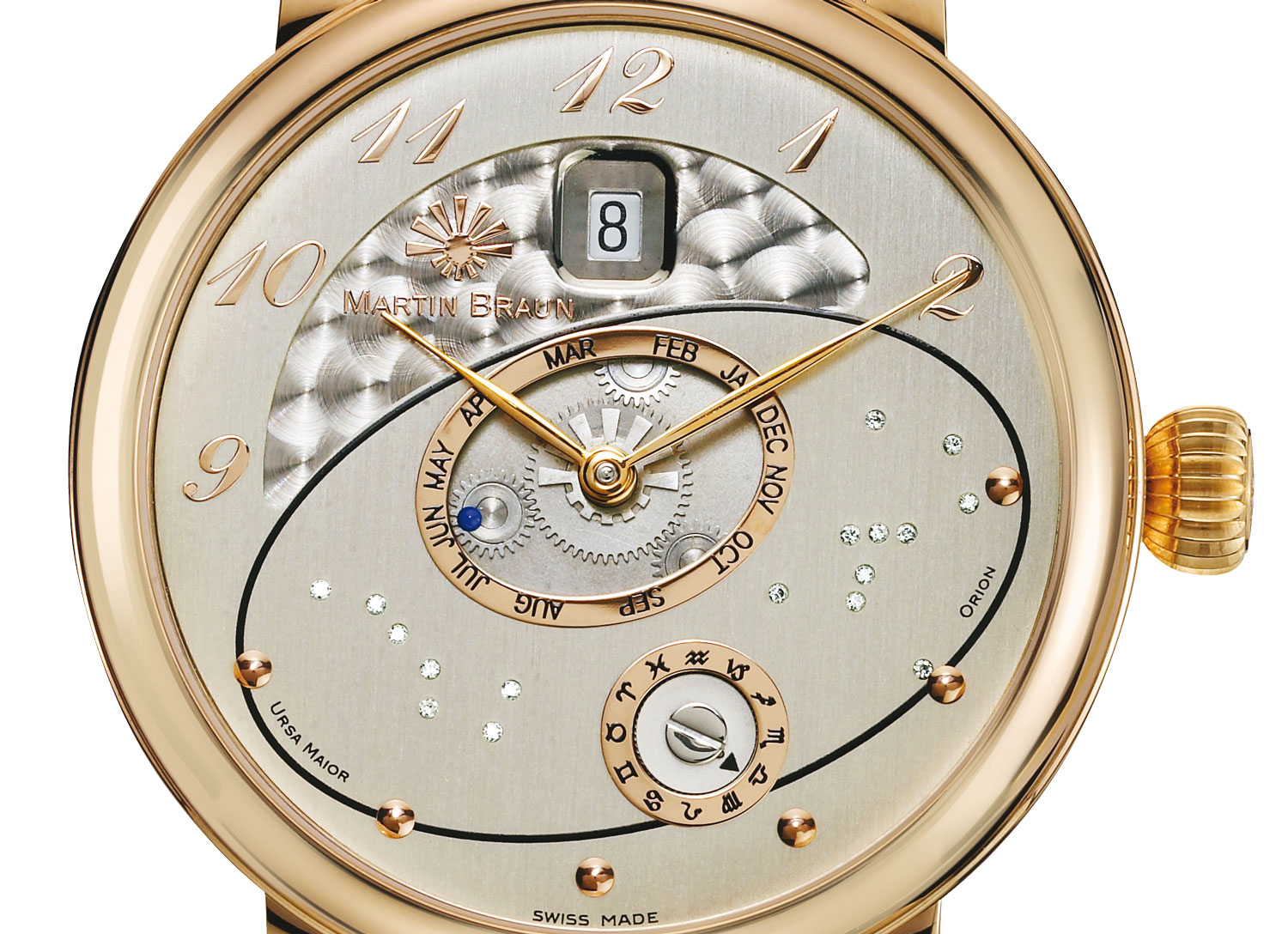 シルバー、ローズゴールドカラーのマーカーとの二層のヘリオゼントリック・デザイン