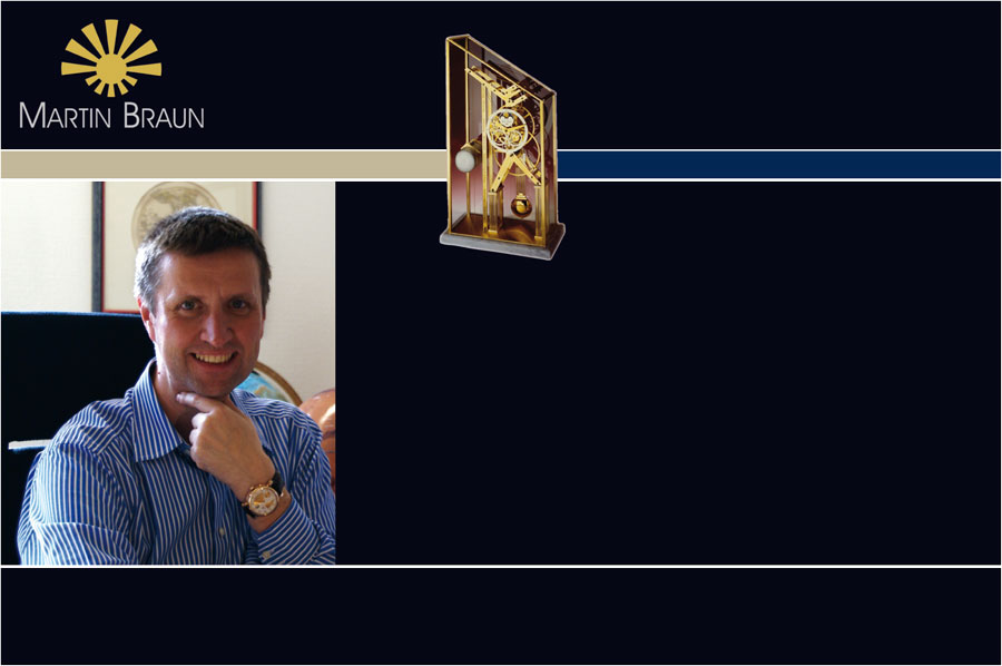 マーティン・ブラウンは、フォルツハイムの名高い時計学校を1983年に主席で卒業し、正式な時計師となった。その後、その名を知られた時計会社で修行を積み、1991年27歳でマイスターウオッチメーカーの資格を取得。彼が最終試験のために作った現代的なテーブルクロックには、彼が自ら開発したエイトデイ・ムーブメント、リパブリカン・カレンダー(1792年から1806年まで使われていたフランス式のカレンダーシステム)、日付、正確なムーンフェイズ、そして均時差表示がついていた。